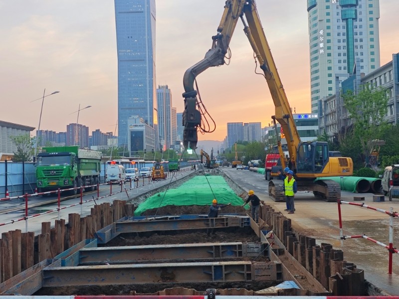 “追求精細(xì)極致,鑄就基坑支護(hù)的穩(wěn)固防線”。項目部將鋼板樁施打質(zhì)量視為確保基坑安全與質(zhì)量的關(guān)鍵環(huán)節(jié),嚴(yán)格執(zhí)行材料準(zhǔn)入制度,所有進(jìn)場鋼板樁均經(jīng)過材質(zhì)證明核查、尺寸精度測量和外觀質(zhì)量檢驗三重把關(guān),確保樁身無裂紋、無銹蝕等質(zhì)量缺陷,從源頭上杜絕不合格材料。施工中,施工人員采用全站儀進(jìn)行動態(tài)監(jiān)測,嚴(yán)格控制樁身垂直度偏差在規(guī)定范圍內(nèi),詳細(xì)記錄每根樁的打入深度、貫入度等關(guān)鍵參數(shù)。拔樁階段采用專用施工設(shè)備,按照“先支后拆、分段拔除”的原則有序進(jìn)行,拔樁后出現(xiàn)的孔隙立即灌砂,最大限度減少對周邊土體的擾動,實現(xiàn)平穩(wěn)施工與環(huán)境保護(hù)的和諧統(tǒng)一。