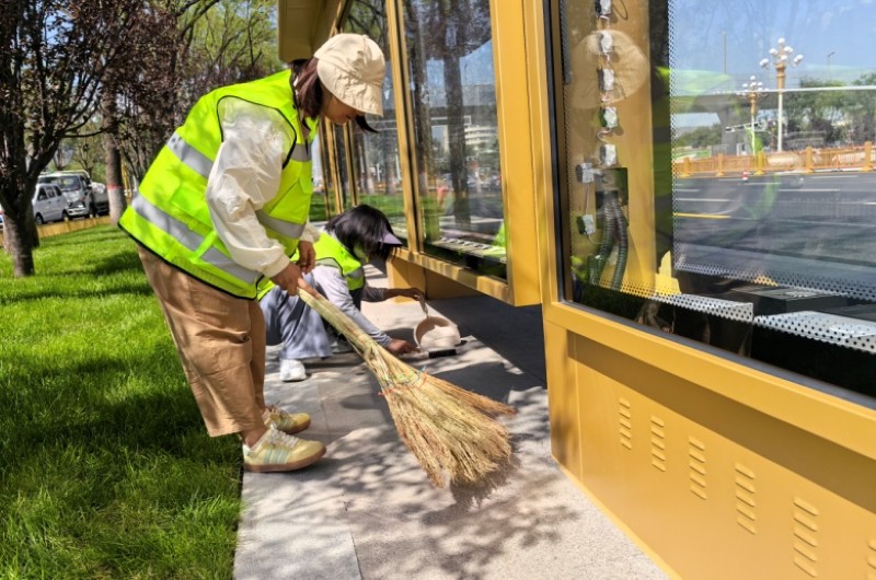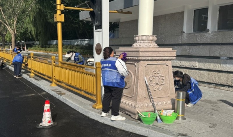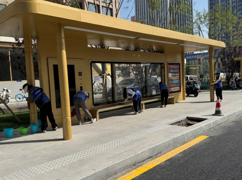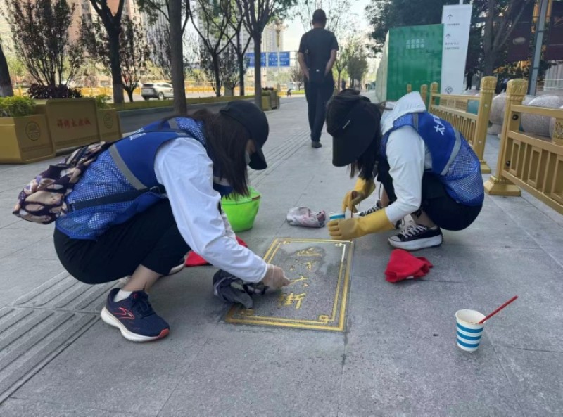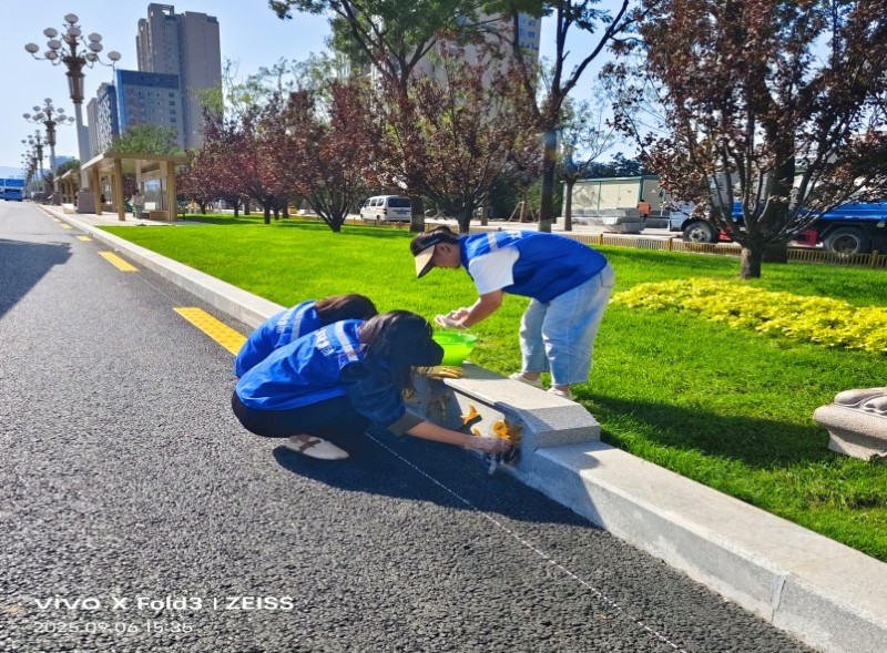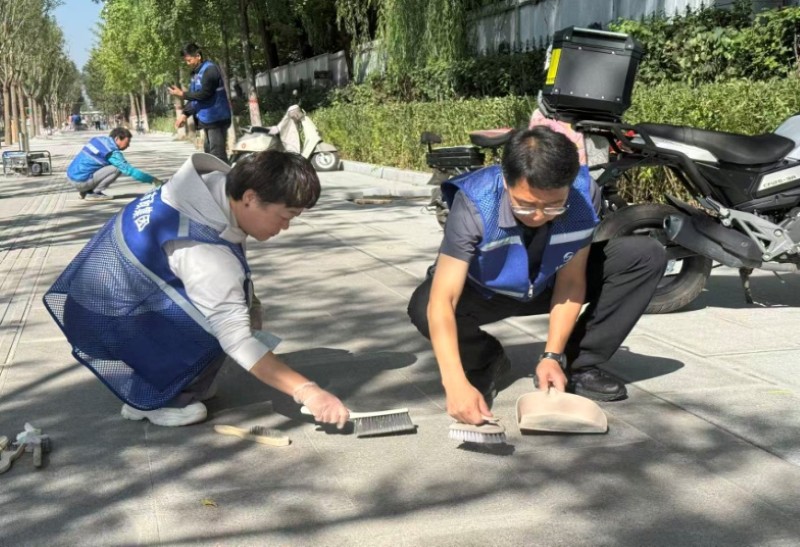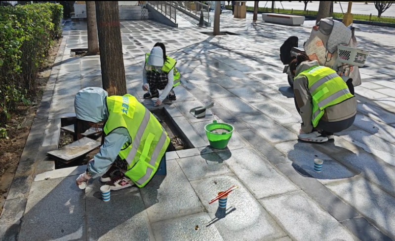 活動(dòng)自9月4日起為期六天,覆蓋迎澤大街(西段)全線,重點(diǎn)圍繞附屬設(shè)施清潔與道路精細(xì)化維護(hù)展開(kāi)?;顒?dòng)中,身著統(tǒng)一藍(lán)色“太原市政集團(tuán)”馬甲的志愿者們,手持長(zhǎng)柄擦洗器、水桶、抹布、鏟刀、掃帚等工具,對(duì)道路兩側(cè)公交站臺(tái)、路燈基地、護(hù)欄、照明燈桿等設(shè)施進(jìn)行系統(tǒng)清理與擦洗;同步推進(jìn)地磚灌縫精細(xì)化維護(hù)作業(yè),通過(guò)專業(yè)操作,確保每一條裂縫都“嚴(yán)絲合縫”,有效提升路面耐用性與通行舒適度,以實(shí)際行動(dòng)為市民出行安全與舒適保駕護(hù)航;同時(shí),志愿者專門對(duì)道路沿線的石頭字景觀展開(kāi)描金作業(yè),細(xì)刷蘸取金色涂料,一筆一畫精心描摹,成為主干道上一道兼具文化氣息與視覺(jué)美感的獨(dú)特風(fēng)景。